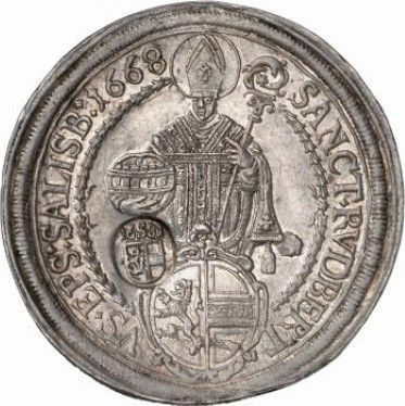 Описание: Святий Руперт стоїть зі своєю сільничкою та пастирським посохом, а нижче зображено герб Зальцбурга. Контрмарка Зальцбурга 16S81.