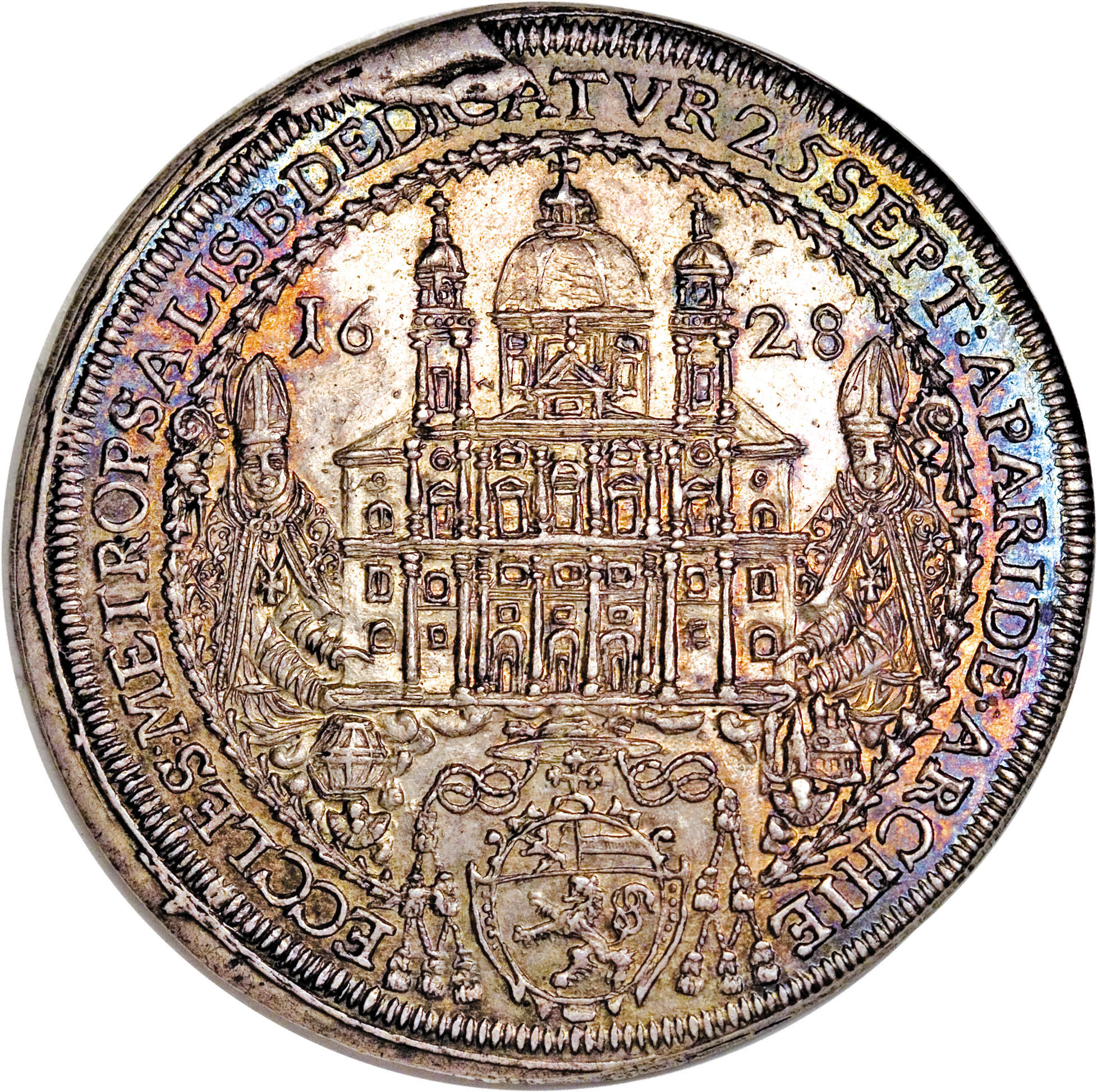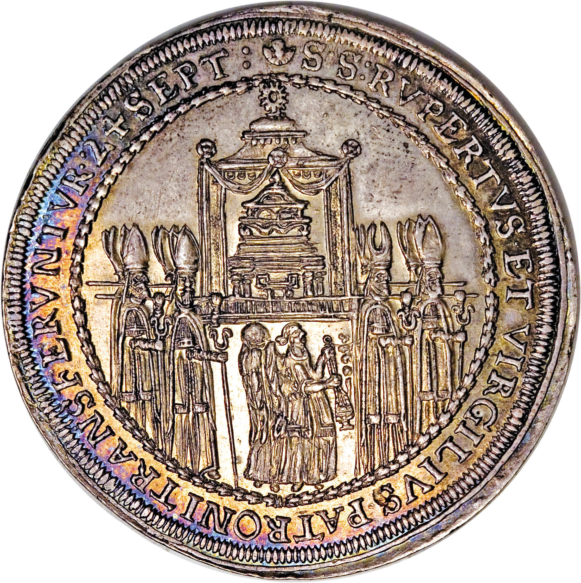 Описание: Єпископи несуть реліквію в облямованому намистом колі, перенесення реліквій святих Руперта та Віргілія 24 вересня 1628 року. Легенда навколо (починається о 12 годині).