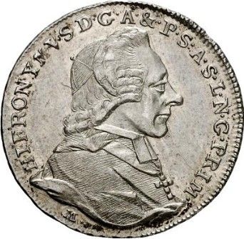 Описание: Праворуч — бюст Ієроніма фон Колоредо, навколо — легенда. Підпис M під бюстом.
