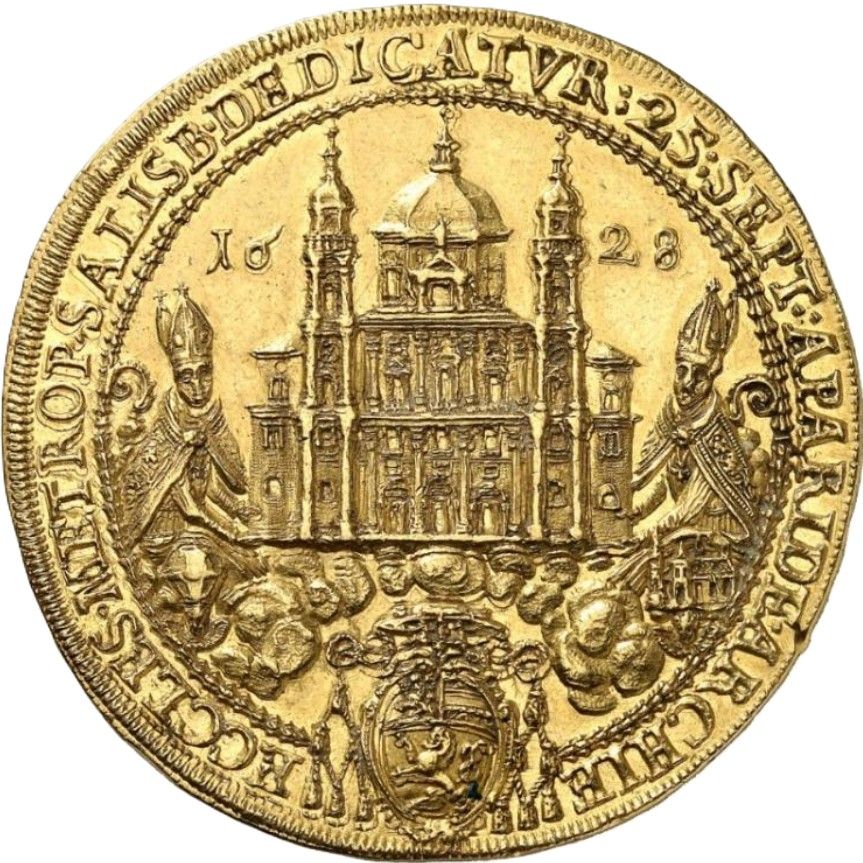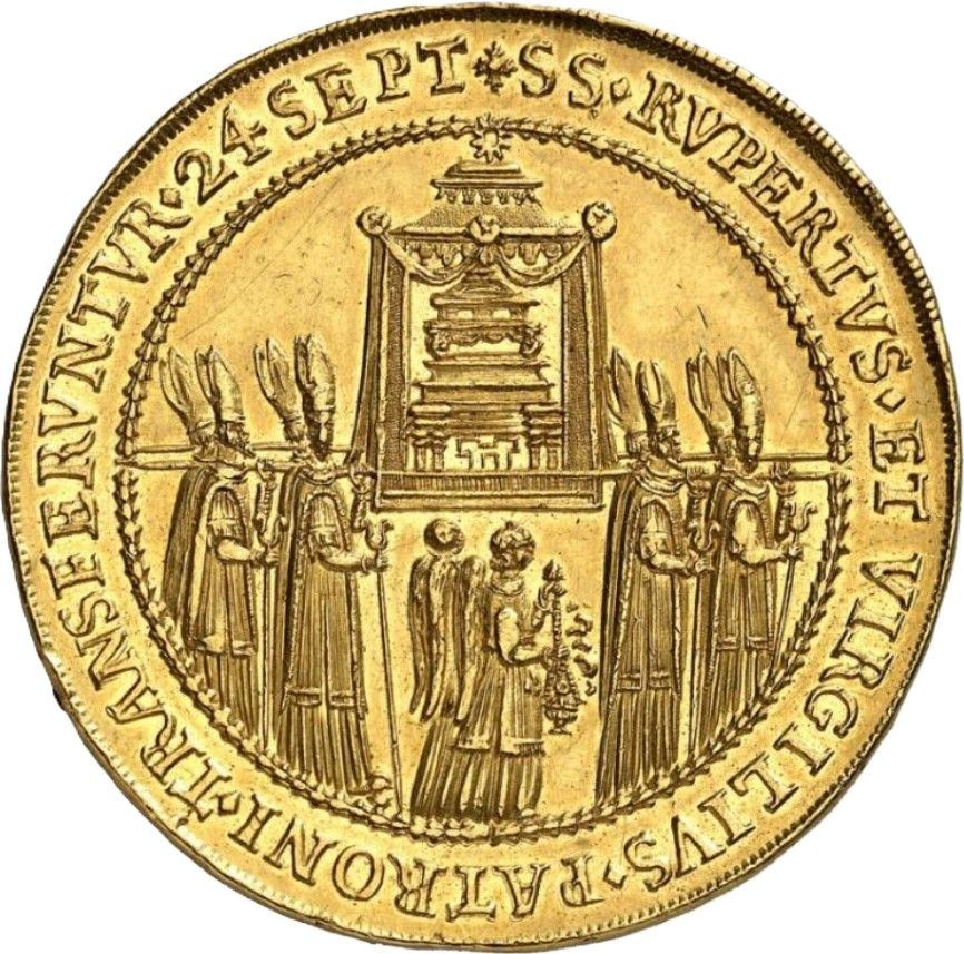 Описание: Єпископи несуть реліквію в облямованому намистом колі, перенесення реліквій святих Руперта та Віргілія 24 вересня 1628 року. Напис навколо.