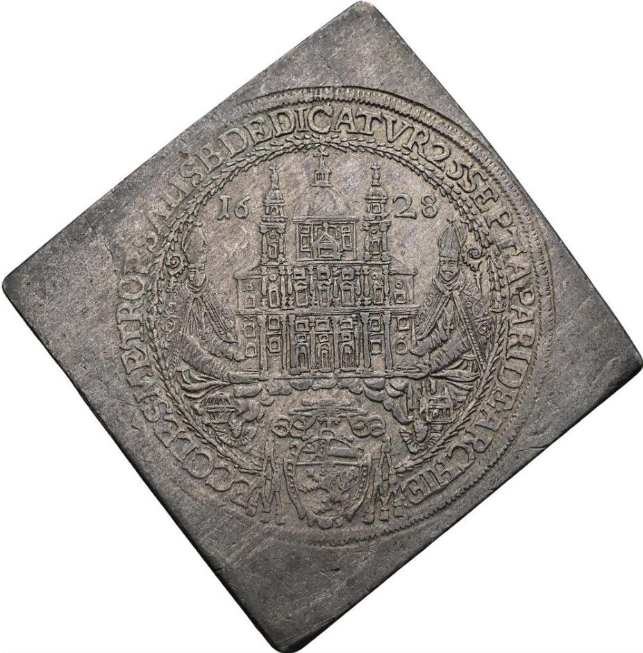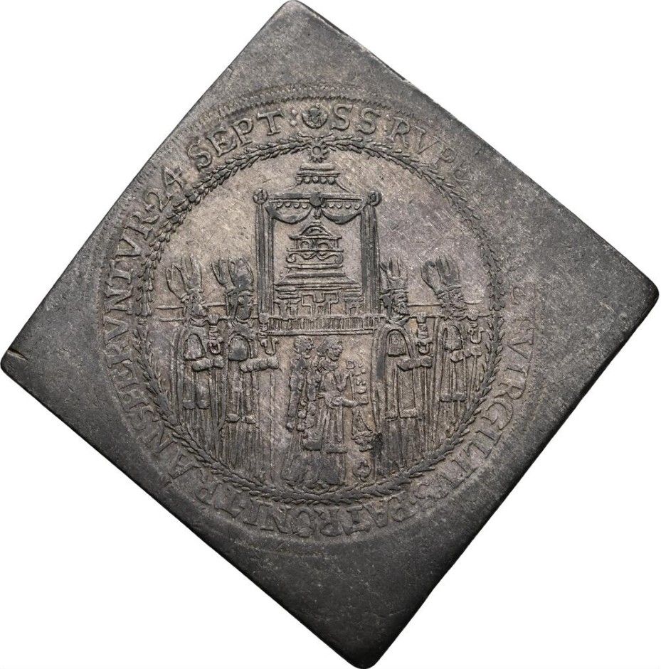 Описание: Єпископи несуть реліквію в облямованому намистом колі, перенесення реліквій святих Руперта та Віргілія 24 вересня 1628 року. Напис навколо.