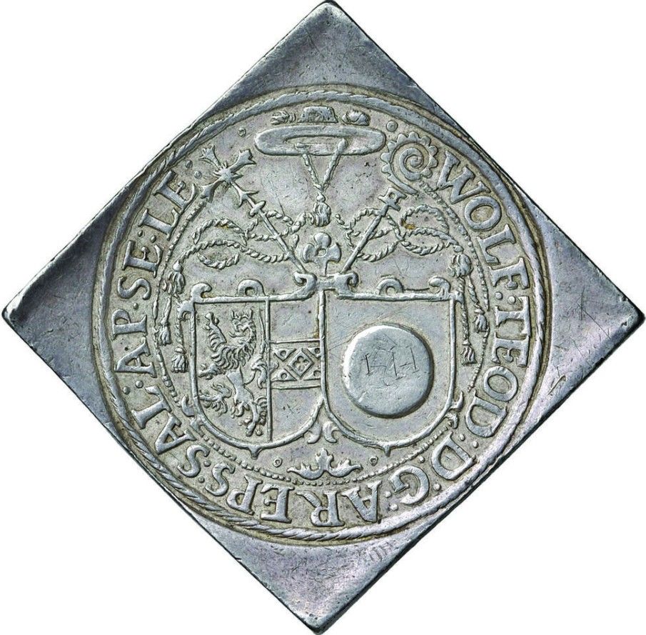 Описание: 2 щити поруч, з гербом єпископства Зальцбурга (ліворуч) та оригінальним гербом родини Вольфа Дітріха (праворуч). Зверху — галеро архієпископа.