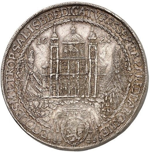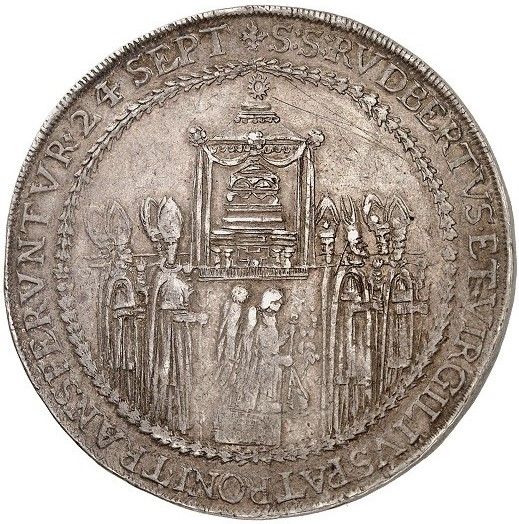 Описание: Єпископи несуть реліквію в облямованому намистом колі, перенесення реліквій святих Руперта та Віргілія 24 вересня 1628 року. Легенда навколо (починається о 12 годині).