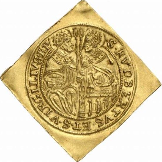 Описание: Святий Руперт (ліворуч, тримає сільничку) і святий Віргілій (праворуч, тримає макет Зальцбурзького собору) сидять, кожен тримає пастуший посох і дивиться один на одного, всередині внутрішнього кола, голови розділяють легенду.