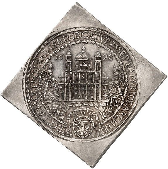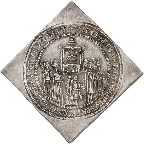 Описание: Єпископи, що несуть реліквію в облямованому намистом колі, перенесення реліквій святих Руперта та Віргілія 24 вересня 1628 року. Легенда навколо (починається о 12 годині).