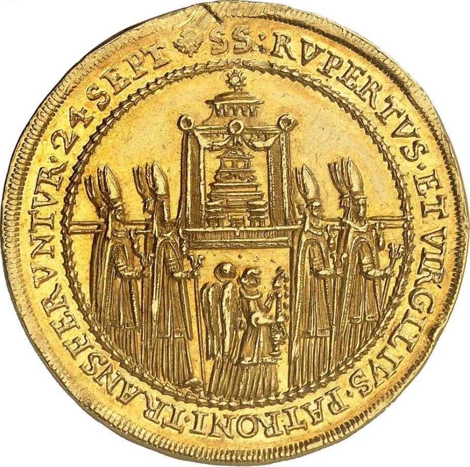 Описание: Єпископи несуть реліквію в облямованому намистом колі, перенесення реліквій святих Руперта та Віргілія 24 вересня 1628 року. Легенда навколо (починається о 12 годині).