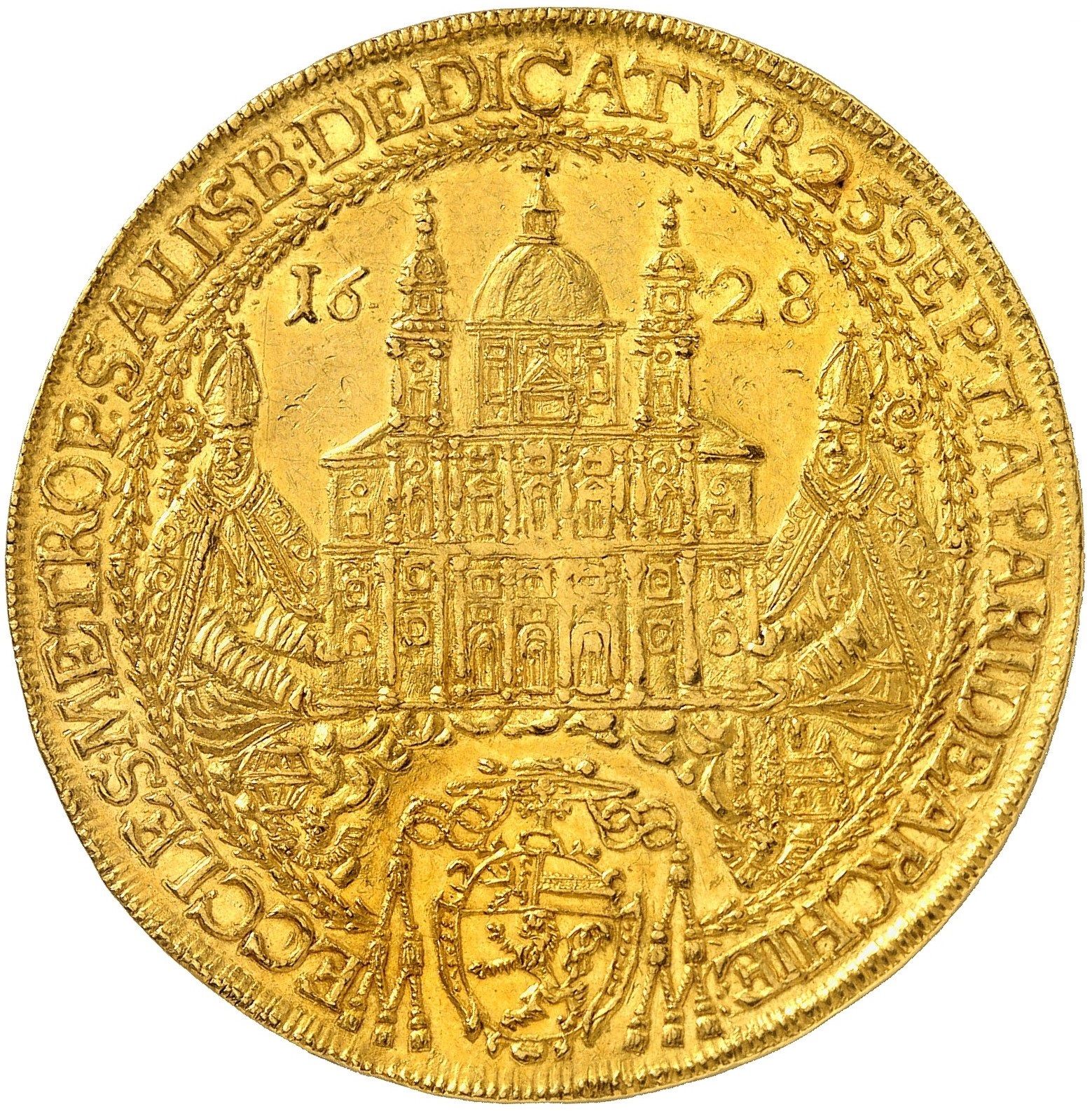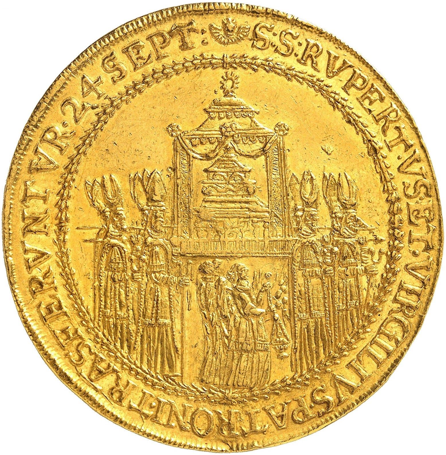 Описание: Єпископи несуть реліквію в облямованому намистом колі, перенесення реліквій святих Руперта та Віргілія 24 вересня 1628 року. Напис навколо.