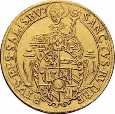 Описание: Святий Руперт, тримаючи сільничку та пастуший посох, сидить на троні над овальним щитом з гербом, розділеним на 7 частин: у 1 і 2 — герб Зальцбурзького архієпископства; у 3 і 6 — герб родини Майєр цу Райтнау; у 4 і 5 — герб лордів Ешенца в Тургау; вгорі — оригінальний герб родини Вольфа Дітріха.