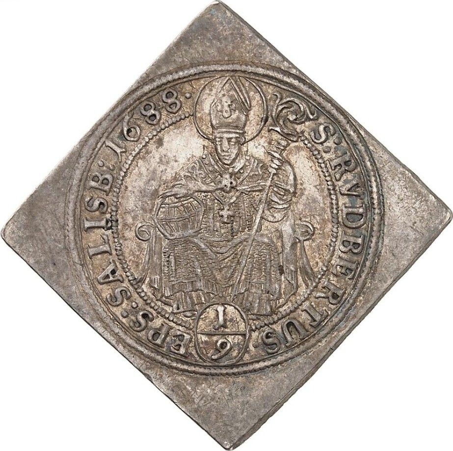 Описание: Святий Руперт сидить, тримаючи сільничку в правій руці та пастуший посох у лівій, навколо — напис (починається з 2h) з датою в кінці. Митра розділяє напис. Дробовий номінал в овальній рамці внизу.