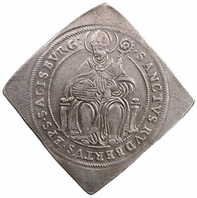 Описание: Святий Руперт, одягнений у єпископські регалії, сидить на троні, обернений на 1/4 ліворуч, тримаючи сільничку та пастуший посох. Напис навколо (починається о 1 годині) з митрою, що розділяє його зверху.