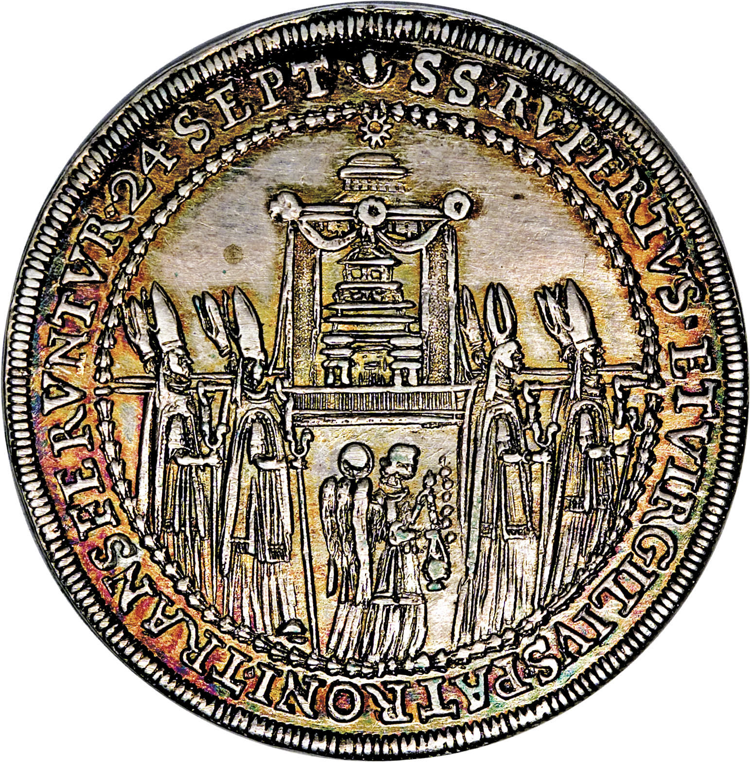 Описание: Єпископи несуть реліквію в облямованому намистом колі, перенесення реліквій святих Руперта та Віргілія 24 вересня 1628 року. Легенда навколо (починається о 12 годині).
