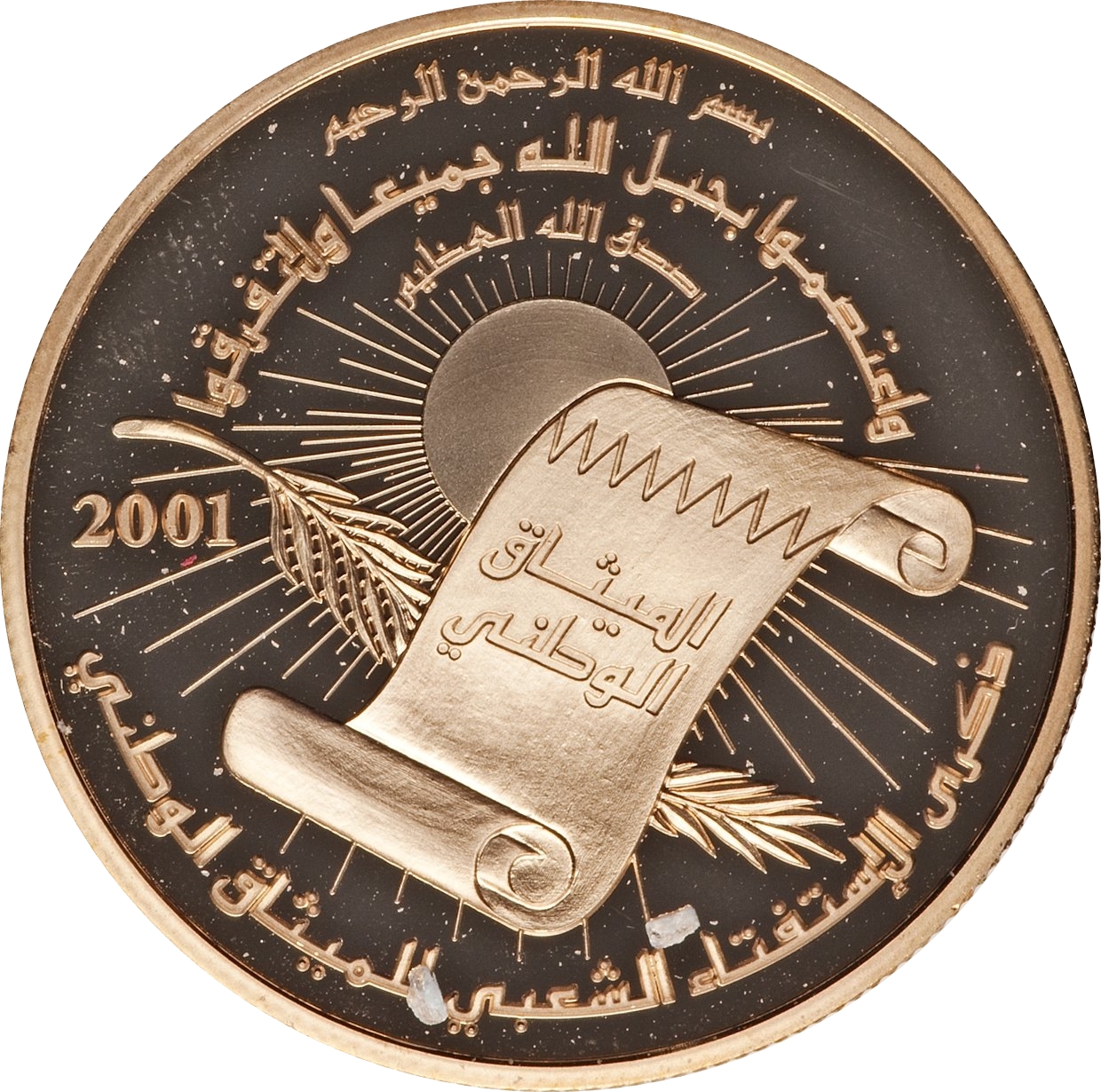 Описание: Вступний документ Національної хартії. Верхня частина містить вірш з Корану, а нижня — нагоду арабською мовою.