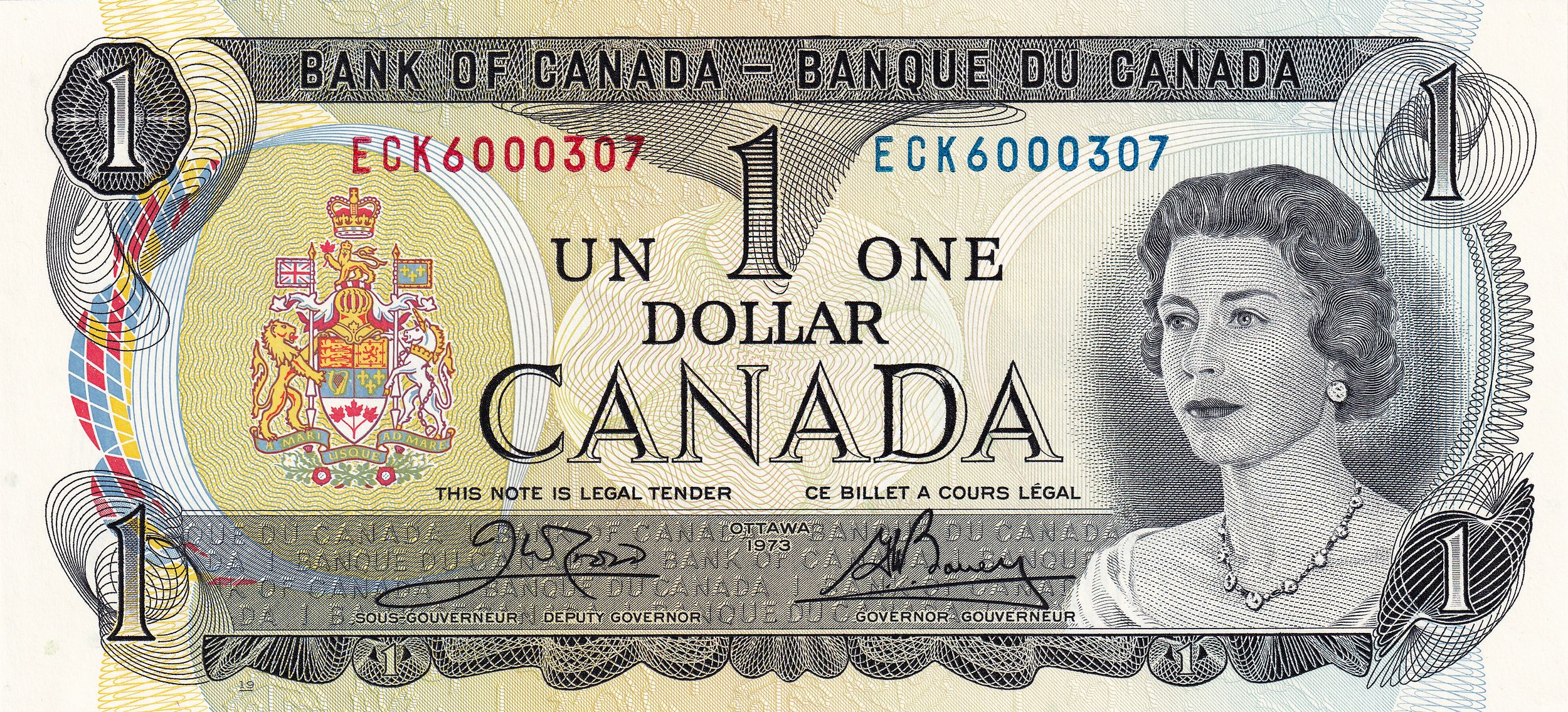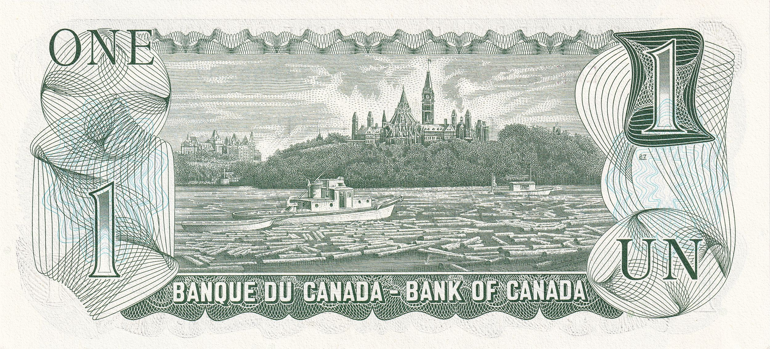 Описание: Чорна рамка, прикрашена абстрактними формами, в яких представлені значення «1». Багатоколірний друк, відомий як «райдужний друк». Кожна банкнота має семизначний серійний номер з 2- або 3-літерним префіксом. Номер ліворуч надрукований червоним кольором, а номер праворуч — синім. Ліворуч зображено «Герб Канади», а праворуч — портрет Єлизавети II, королеви Англії та Співдружності.