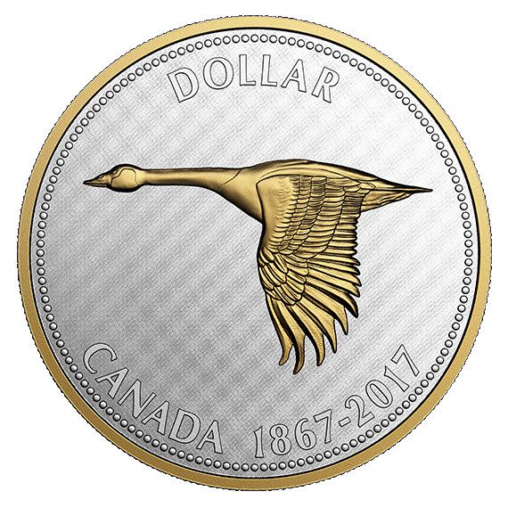 Описание: Мотив на реверсе воспроизводит мотив, который появился на долларе 1967 года, разработанном канадским художником Алексом Колвилем: канадская гусь в полете, вид сбоку. Тонко высеченные детали идеально передают особенности птицы, в том числе текстуру ее больших перьев, когда она машет крыльями над страной. Мотив подчеркивается выборочным золотым покрытием, нанесенным на сороку и ободок монеты. На реверсе также выгравированы номинал «1 DOLLAR», слово «CANADA» и юбилейные даты «1867-2017».
