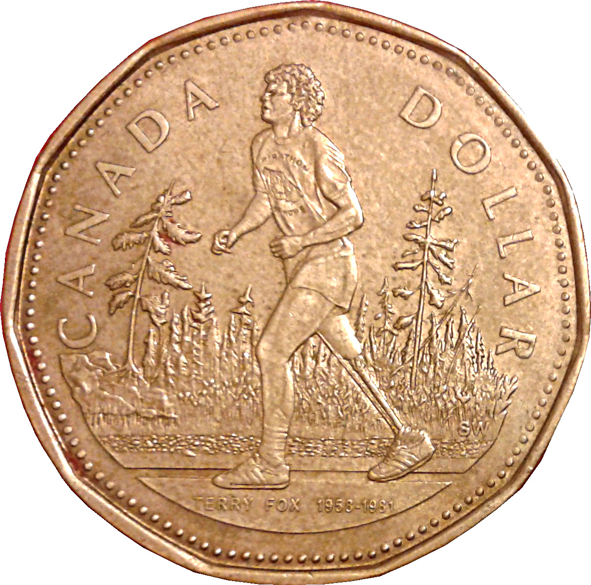 Описание: Терранс Стэнли «Терри» Фокс, CC (1958-1981), канадский гуманист, спортсмен и активист в области лечения рака, пробежал с одной протезной ногой марафон надежды, кросс-канадский забег с целью сбора средств для исследования рака, окружен надписью «CANADA» и номинальной стоимостью.
