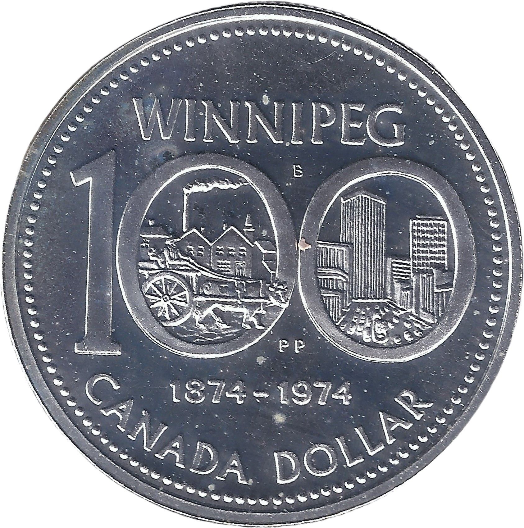 Описание: Цифра 100, всередині кожного нуля якої зображено головну вулицю Вінніпега в 1874 році (ліворуч) або 1974 році (праворуч), оточена написом «WINNIPEG», датами «1874-1974», написом «CANADA» та номінальною вартістю.