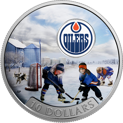 Описание: Цветной логотип Edmonton Oilers, три ребенка, играющие в хоккей на льду на заднем плане, номинал внизу.