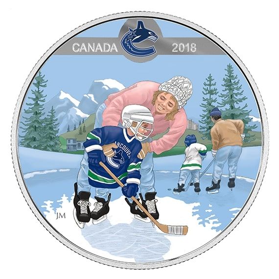 Описание: Зимний пейзаж на хоккейной площадке, где взрослый помогает ребенку встать на коньки и практикуется в обращении с клюшкой, вверху логотип команды Vancouver Canucks.