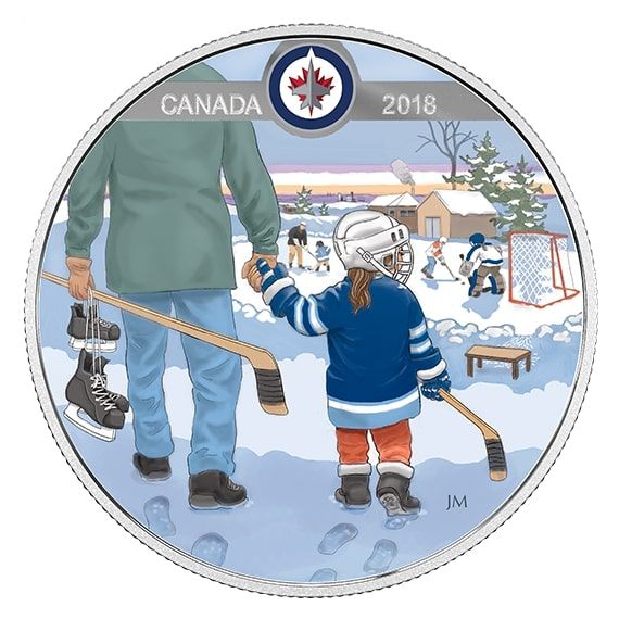 Описание: Зимний пейзаж на хоккейной площадке с взрослым и ребенком в майках Jets, идущими к катку, логотип команды Winnipeg Jets вверху.