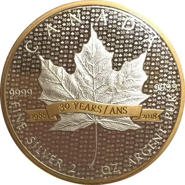 Описание: Культовый дизайн монеты «Серебряный кленовый лист» с добавлением свитка, посвященного 30-летию монеты. Поле заполнено лазерной гравировкой с повторяющимся узором, состоящим из кленового листа и цифры «30».
