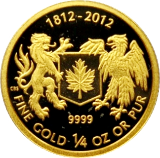 Описание: Орел, представляющий американские войска, мощно противостоит льву, символизирующему британские войска. Между ними простирается щит военного конфликта, на котором изображен кленовый лист, означающий общую решимость англо- и франкоязычных канадских добровольцев и воинов коренных народов, которые вместе смело защищали свою землю и образ жизни.