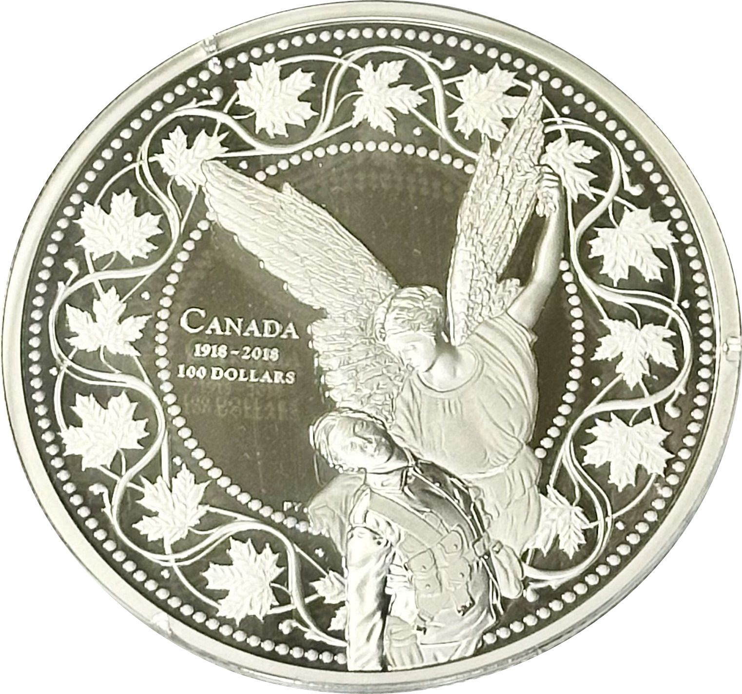 Описание: В честь 100-летия Компьенского перемирия (11 ноября 1918 г.) изображение вашей монеты, созданное Пандорой Янг, объединяет несколько элементов дизайна, уходящих корнями в историю. Центральным элементом дизайна является редко встречающийся вид сверху на статую Ангела Победы, один из трех идентичных бронзовых мемориалов, созданных монреальским скульптором Кур де Лион Маккарти. Здесь статуя является мощным напоминанием о человеческих жертвах войны, воплощенных в образе павшего канадского солдата, которого держит восходящий ангел, держащий в левой руке лавровый венок. Две фигуры перекрывают рамку, вдохновленную канадской монетой номиналом в один цент, которая была в обращении во время Первой мировой войны (1914–1918 гг.); венок из 16 кленовых листьев представляет собой современную интерпретацию дизайна кленовых лоз, который можно было увидеть на всех канадских пенни в период с 1858 по 1920 год, а два кольца из точек — одно из 100 точек, другое из 140 — сохранены в неизменном виде из классического дизайна W.H.J. Блейкмора.