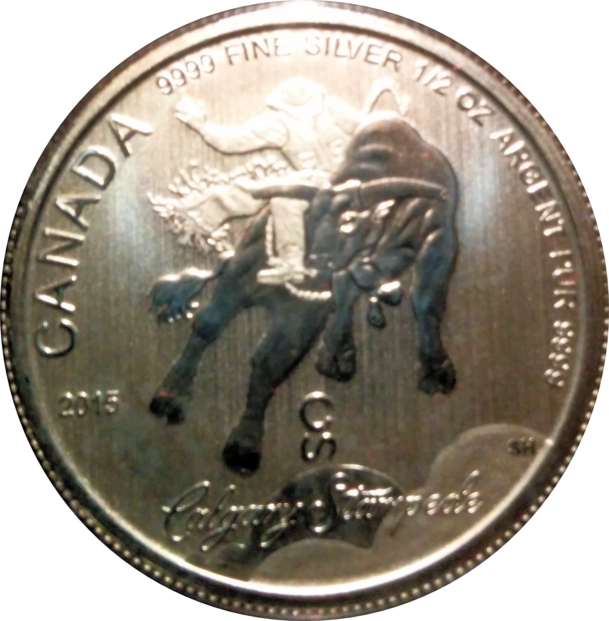 Описание: Ковбой, решительно скачущий на свирепом быке над стилизованными облаками пыли, и логотип Calgary Stampede с надписью «Canada 9999 Fine Silver ½ oz Argent Pur 9999 2015 Calgary Stampede» и инициалами художника.