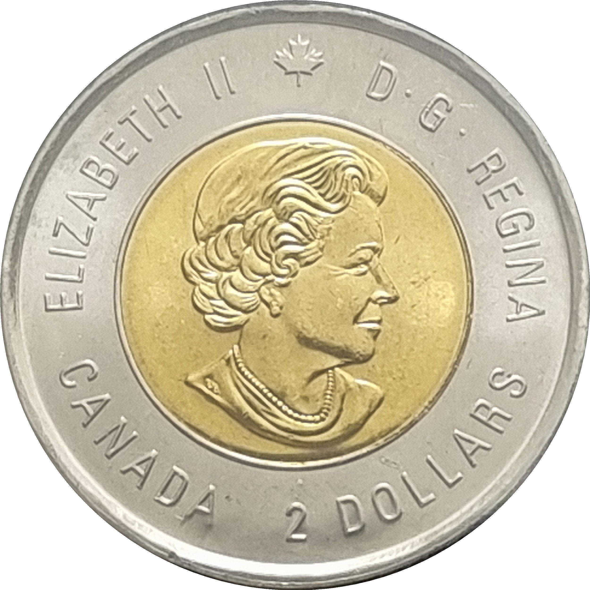 Гурт: Прерывистые зубцы с надписью, разделенной кленовым листом Положение A — надпись на гурте читается нормально, когда аверс находится сверху Положение B — надпись на гурте читается нормально, когда реверс находится сверху (CANADA * 2 DOLLARS *)