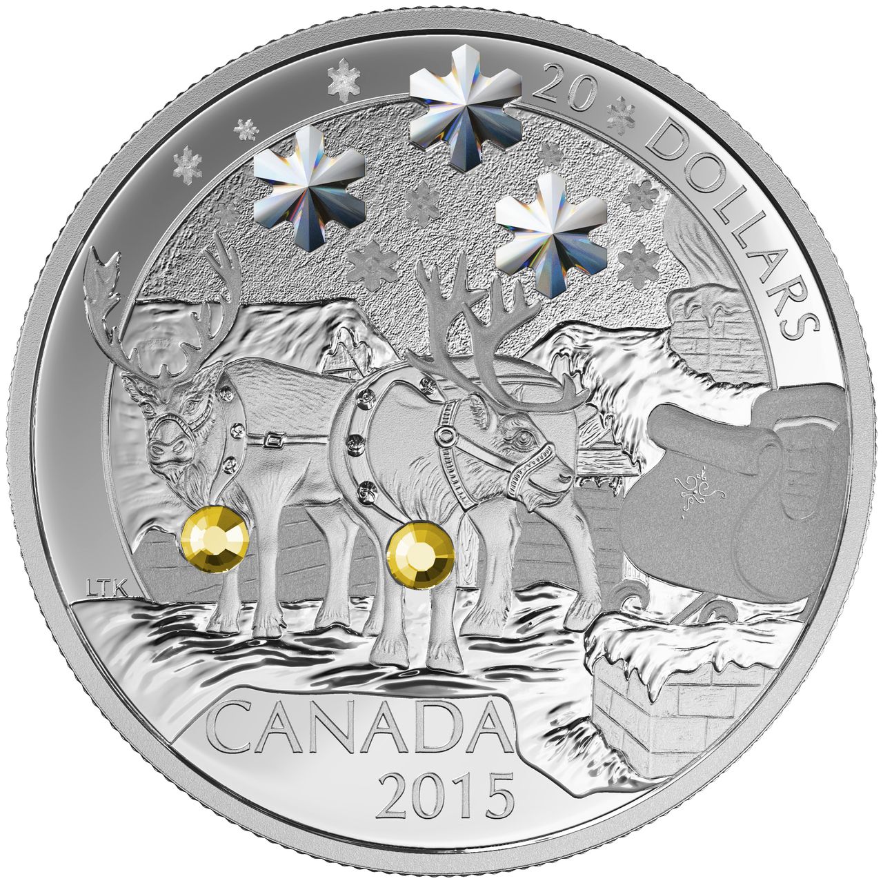 Описание: Монета, разработанная канадским художником Лизой Томсон-Хан, вдохновляет на новую веру в магию праздников. В этой зимней стране чудес три кристалла Swarovski® в форме снежинок добавляют блеска ночному воздуху, а пушистые белые снежинки мягко падают на спящий пейзаж. Вид необычный: кирпичные дымоходы на заднем плане и перекрывающие край справа от изображения; учитывая присутствие определенных копытных животных и знаменитых саней, сразу становится ясно, что это канун Рождества и мы являемся редкими свидетелями особого момента. Там, на крыше жилого дома, видны два оленя, их черты красиво переданы с помощью детальной гравировки. Взгляд зрителя естественным образом притягивают два круглых желтых элемента из кристаллов Swarovski®, которые висят на упряжи оленей и блестят на фоне снега. Один из оленей, стоя в ожидании, поворачивает голову, чтобы взглянуть на сани, как будто он готов дать сигнал своему пассажиру о возвращении, чтобы они могли продолжить свое волшебное путешествие.