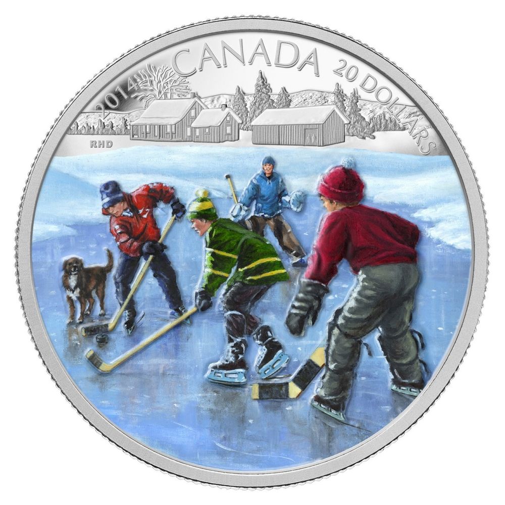Описание: Классическая сцена известного канадского художника Ричарда Де Вольфа: два мальчика сражаются за шайбу, а два вратаря следят за каждым их движением, готовые заблокировать шайбу, которая может полететь в их сторону. На заднем плане деревянные здания, деревья и пологие холмы дополняют сельский пейзаж.
