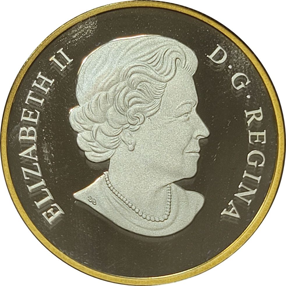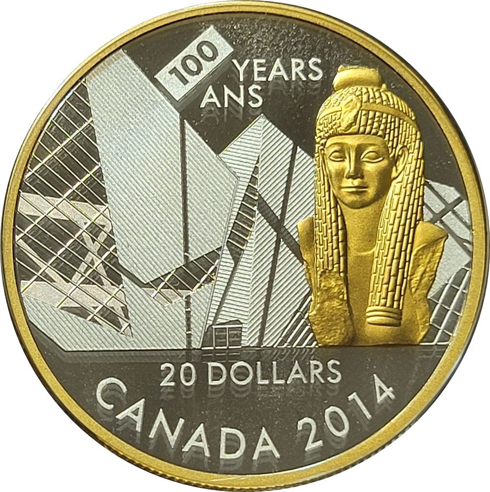 Описание: На этой монете изображена позолоченная статуя Клеопатры VII, уникальный экземпляр, приобретенный в начале 1900-х годов первым директором музея. Этот древний гранитный бюст считается редким, идеализированным изображением египетской царицы, чьи романтические завоевания принесли ей бессмертие. За бюстом возвышается кристаллическая форма здания Michael Lee-Chin Crystal, занимающая большую часть изображения и добавляющая современный элемент в дизайн. Его угловые призматические структуры воспроизведены с прекрасной детализацией — от алюминиевых полос, придающих зданию вид матового металла, до многочисленных окон, которые улавливают и отражают свет. Столетие музея отмечено над зданием надписью «100 YEARS ANS», а внизу выгравированы номинальная стоимость «20 DOLLARS» и слово «CANADA».