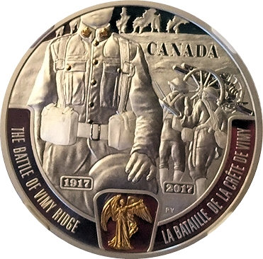 Описание: На фоне поля сражения на реверсе изображен крупный план одинокого канадского солдата, лицо которого намеренно опущено, чтобы символизировать любого из участников битвы при Вими-Ридж (9–12 апреля 1917 г.). Выборочное золотое покрытие придает золотистый оттенок хаки-куртке с поясом, съемными погонами и воротником-стойкой, на котором изображен знак канадских экспедиционных сил в виде кленового листа. Этот «неизвестный солдат» держит в левой руке стальной шлем; за его левым плечом видна одна из многочисленных 18-фунтовых пушек, которые обеспечивали артиллерийский огонь, использовавшийся канадцами в ходе наступательной операции. Под солдатом находится крылатая фигура «Победы», с выборочным золотым покрытием, использованным для воссоздания бронзовой медали «Победа», которая была вручена солдатам союзников в 1919 году.