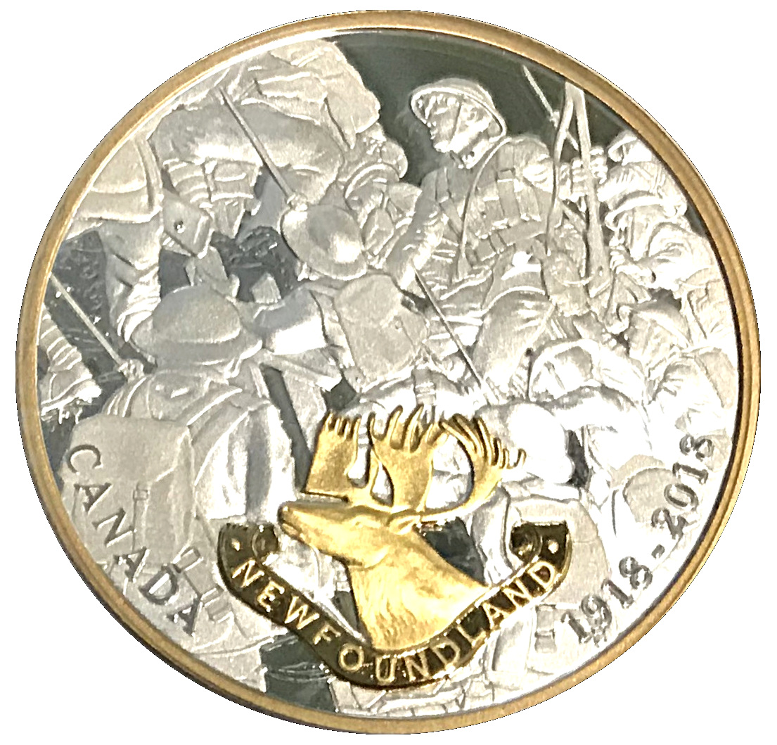 Описание: Многослойная отделка придает гравированному рисунку ощущение глубины: толпа солдат Королевского Ньюфаундлендского полка мчится к лестницам и перелезает через вершину. Ни один солдат не оглядывается назад — все взоры устремлены на подъем и то, что ждет впереди; это свидетельство героического боевого духа жителей Ньюфаундленда, которые раз за разом собирали всю свою храбрость и шли на смерть во имя дела союзников. Выборочное золотое покрытие подчеркивает знак Королевского Ньюфаундлендского полка, на котором изображен лесной карибу, вызывающе стоящий лицом к лицу с врагом.