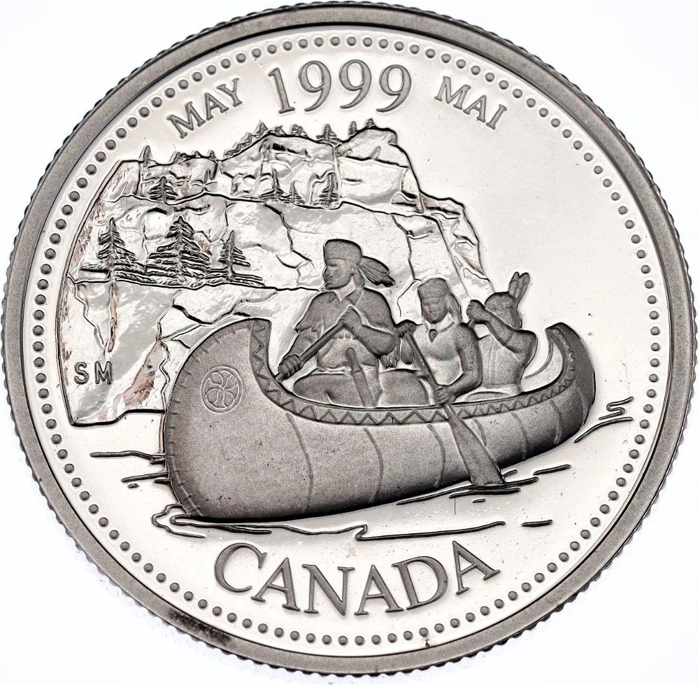 Описание: На монете с дизайном под названием «Les Voyageurs» изображены путешественники, которые путешествовали по рекам Канады на каноэ, чтобы исследовать новые земли и развивать торговлю мехом, в окружении надписи «CANADA» и двуязычной даты: «MAY 1999 MAI».