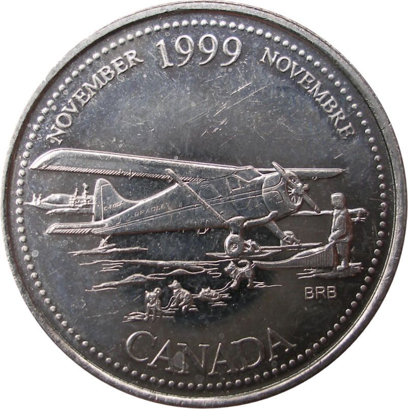 Описание: На монете с изображением «Самолет открывает Север» изображен самолет для полетов в условиях бездорожья, который помог открыть Северную Канаду, в окружении названия страны и двуязычной надписи «NOVEMBER 1999 NOVEMBRE».