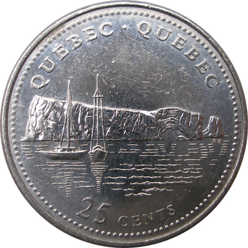 Описание: Дизайн, представляющий провинцию Квебек — парусники у скалы Персе — окружен номиналом и двуязычной надписью «QUEBEC • QUÉBEC».