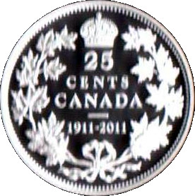 Описание: Дизайн такой же, как у монеты номиналом 25 центов 1911 года (номинал, дата и страна, окруженные листьями, корона вверху).