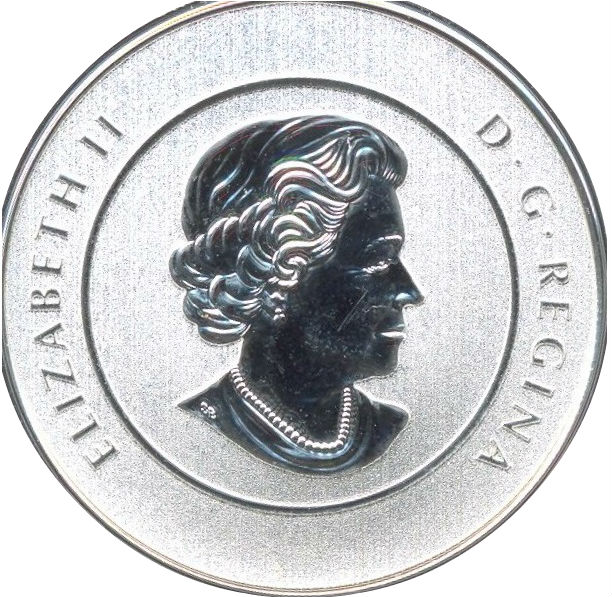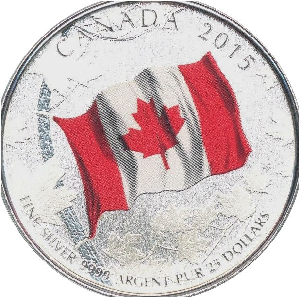 Описание: Цветной канадский флаг, дата вверху, вес металла и проба внизу.