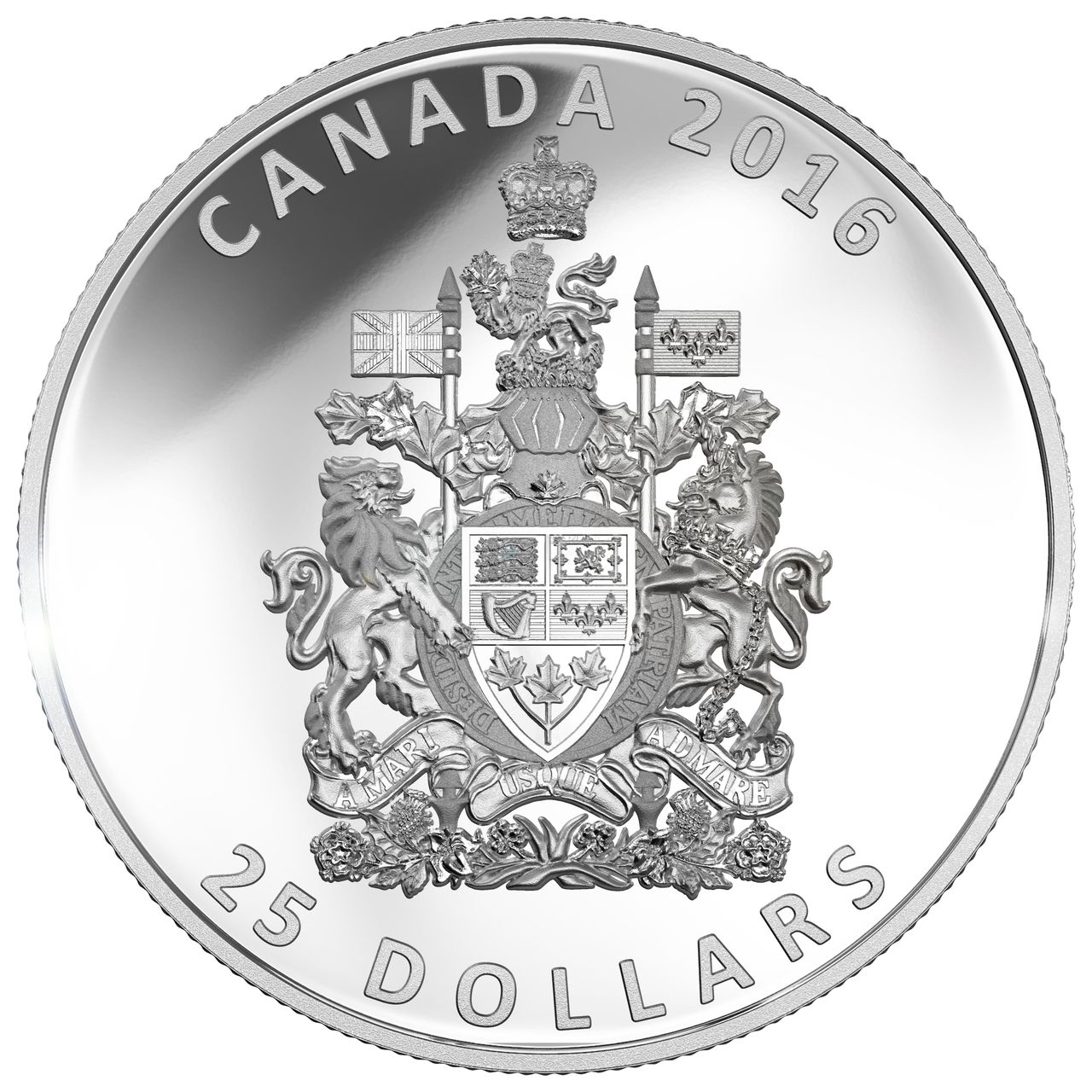 Описание: На реверсе монеты изображен точно воспроизведенный герб Канады. В нижней части герба изображена гирлянда из цветочных символов — английской розы, шотландского чертополоха, ирландского трилистника и французской лилии — под свитком с девизом Канады «A MARI USQUE AD MARE» (От моря до моря). В центре находится щит; в верхних квадрантах изображены три королевских льва Англии, королевский лев Шотландии, королевская ирландская арфа Тара и королевские лилии Франции, а в нижней части — веточка с тремя кленовыми листьями, символизирующая канадцев всех национальностей. По обеим сторонам щита находятся опоры, основанные на опорах королевского герба Соединенного Королевства: слева — лев, держащий копье с флагом Великобритании, а справа — единорог (королевский символ Шотландии), держащий королевский флаг Франции. На ленте за щитом написано «DESIDERANTES MELIOREM PATRIAM» (Они желают лучшей страны), а над щитом находится королевский шлем, увенчанный мантией из кленовых листьев. На вершине королевского шлема находится герб, установленный на венке из переплетенной бело-красной ткани, и состоящий из коронованного льва, держащего кленовый лист в правой лапе. Над гербом изображена императорская корона, символизирующая монарха как главу государства Канады. На оборотной стороне монеты также выгравированы номинал «25 DOLLARS», слово «CANADA» и год «2016».