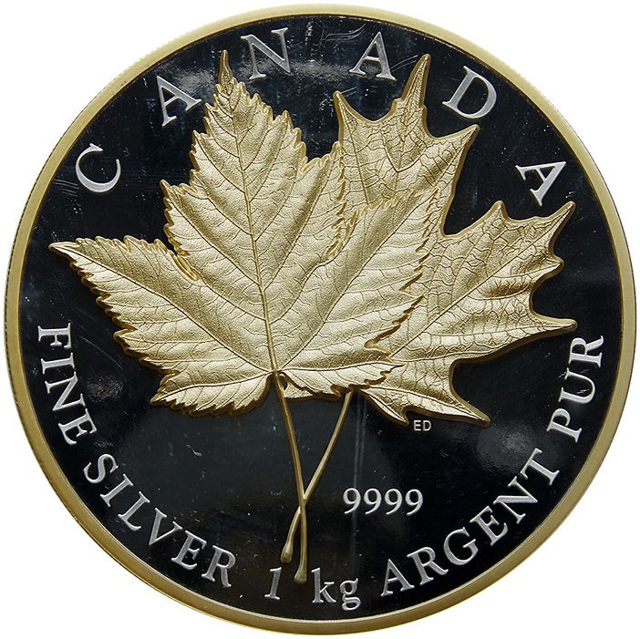Описание: Монета была разработана канадским художником Эмили Дамстра и изображает знаковый кленовый лист Дугласа, перекрывающий лист сахарного клена, украшенный выборочным золотым покрытием. На реверсе также имеются надписи «CANADA» и «FINE SILVER 1 kg ARGENT PUR».