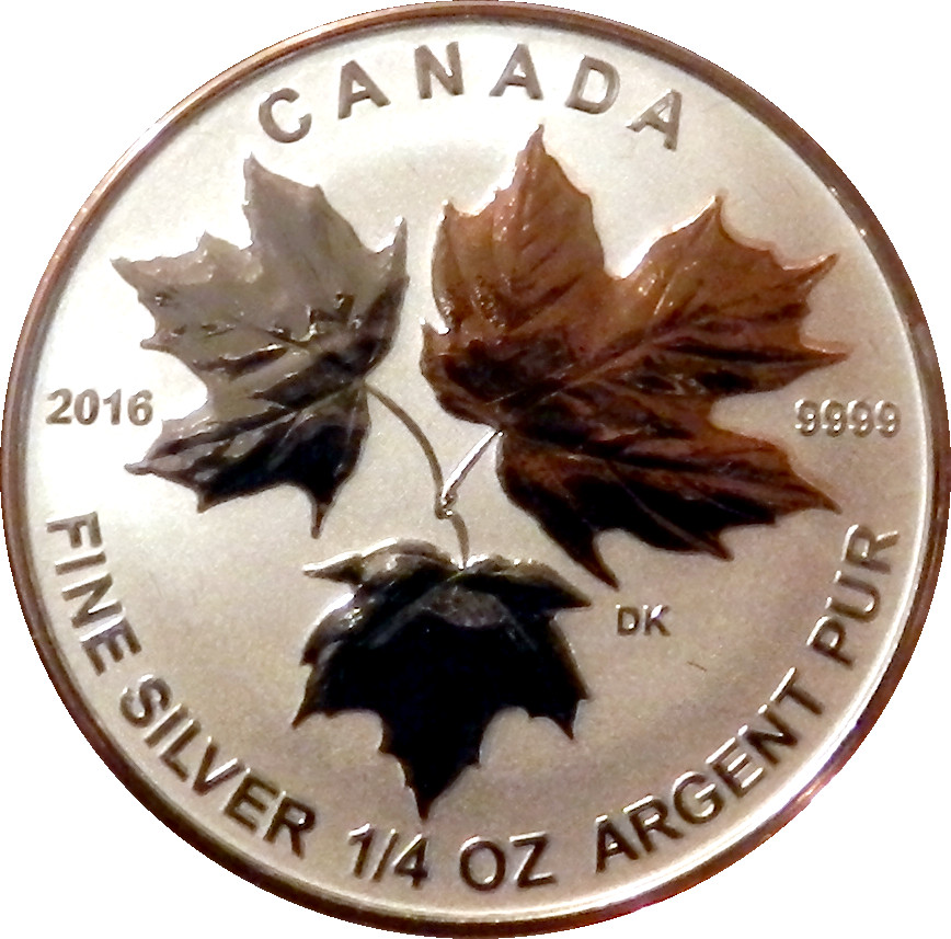 Описание: Три выгравированных кленовых листа в ободке, окружающем слово CANADA и год 2016. Самый большой кленовый лист покрыт розовым золотом.