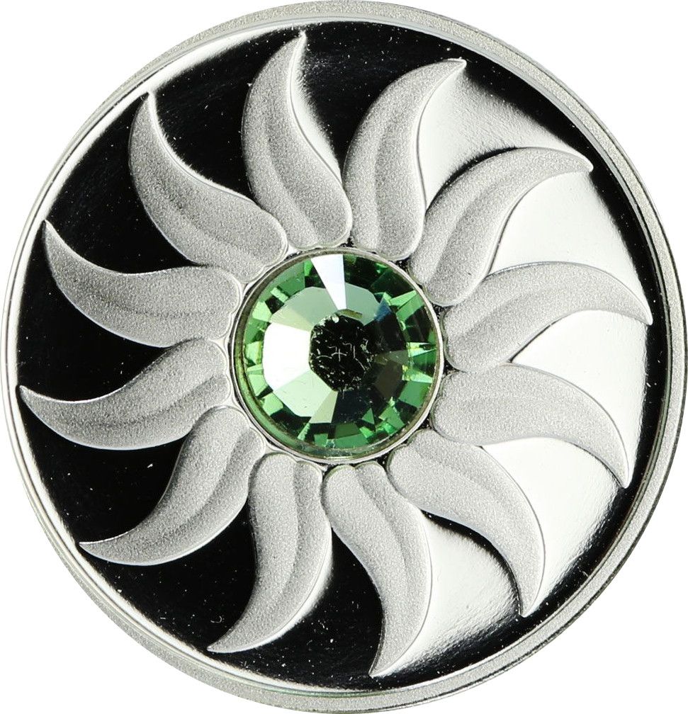 Описание: Вбудований кристал Swarovski (забарвлений під смарагд) у центрі вихору з 12 пелюсток квітів, кожна з яких символізує місяць.