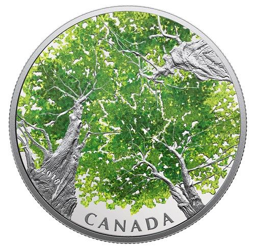 Описание: Ваша монета демонстрирует живописную красоту сахарного клена (Acer saccharum) в яркий летний день. Уникальная перспектива создает впечатление, будто вы стоите у подножия знакового канадского дерева и смотрите вверх на выгравированные стволы и ветви, устремленные все выше в безоблачное небо. Вдохновленный природным явлением «кроны-застенчивости», цветной кленовый полог отмечен тонкими границами света, которые образуют характерную форму среди листьев, где блеск пробной отделки заменяет солнечный свет.