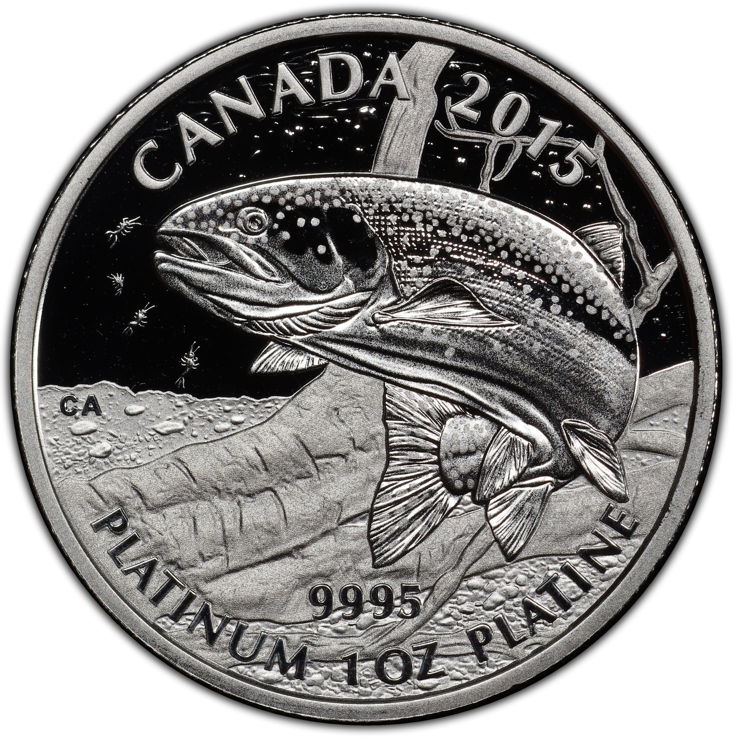 Описание: Монета, разработанная канадским художником Кертисом Атвотером, представляет собой портрет радужной форели в ее естественной среде обитания. Изображение сосредоточено вокруг радужной форели, вид с левой стороны. Передняя часть тела наклонена к зрителю, а хвост закручивается позади и влево на заднем плане. Такое представление подчеркивает уникальную торпедообразную форму тела форели с маленькой головой, характерными пятнами и затененной полосой вдоль бока. Рыба парит возле упавшей ветки дерева, которая заполняет задний план, в мелкой реке с гравийным дном.