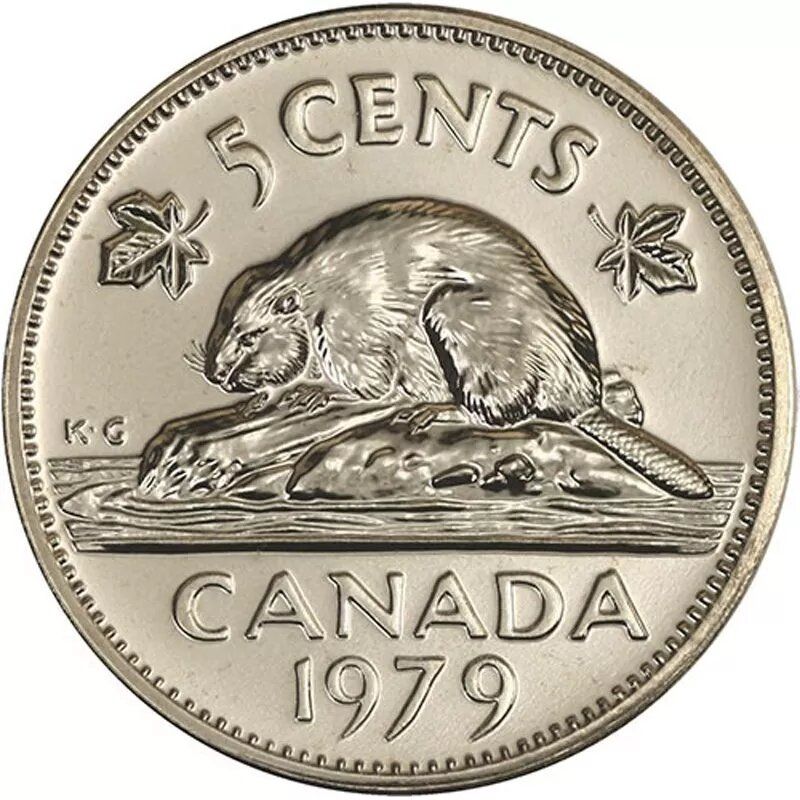 Описание: Североамериканский бобр (научное название: Castor canadensis) над названием страны, окруженный номиналом, по бокам от которого изображены кленовые листья.