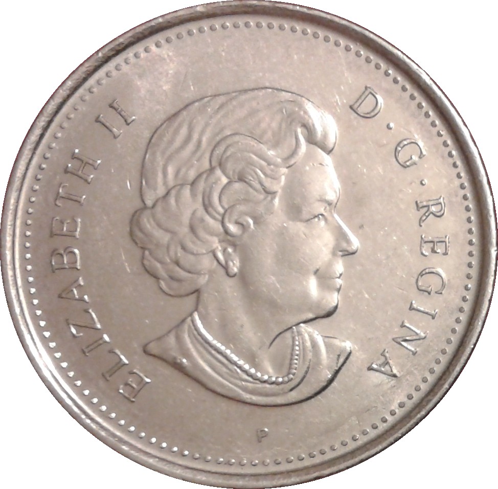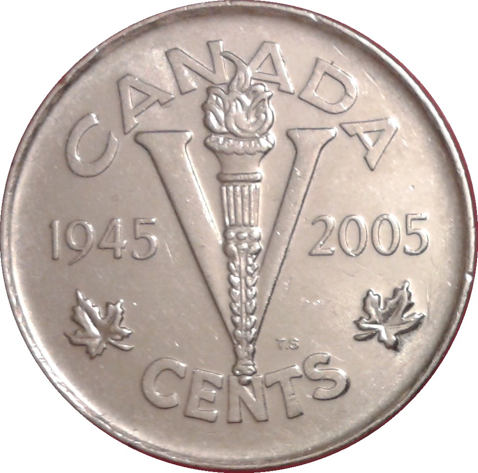 Описание: Репродукція монети, викарбуваної з 1943 по 1945 рік: центральна літера «V», що означає як перемогу, так і номінал, з написом «CENTS» під нею, оточена двома кленовими листям, на яких накладено факел, з назвою країни зверху, зліва датою «1945» і справа «2005».