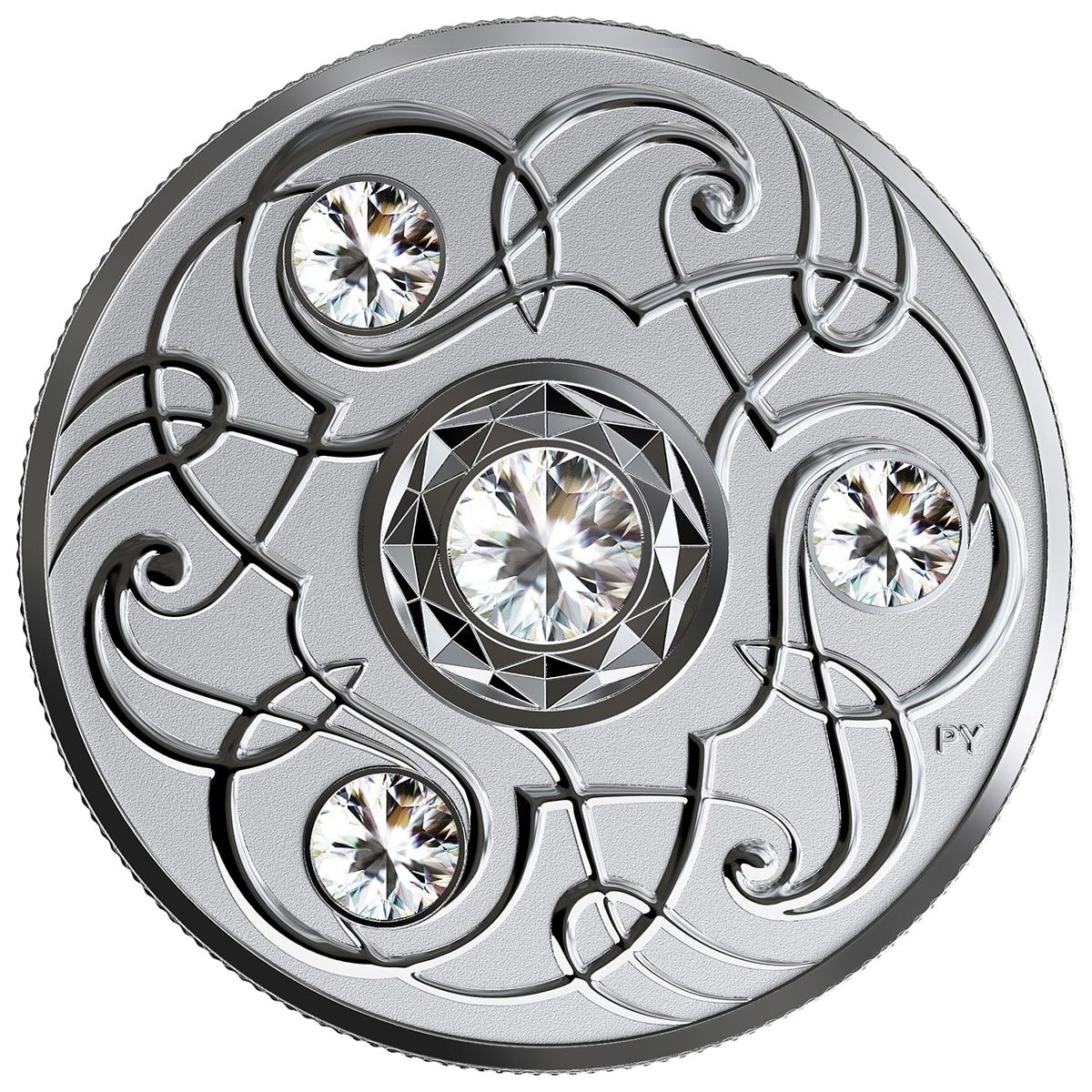 Описание: Дизайн реверса, созданный художницей Пандорой Янг, представляет собой пересечение искусства и математики и отличается стилизованным узором, расположенным в соответствии с шестиугольной системой счисления. Вдохновленный кельтским трискеле, гравированный узор включает в себя три прозрачных кристалла Swarovski®, которые символизируют камень месяца рождения тех, кто родился в апреле, представленный драгоценным кристаллом Swarovski® в центре монеты.