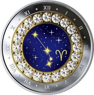 Описание: Монета, розроблена канадським художником Йорі ван дер Лінде, має зовнішнє кільце з римськими цифрами, схоже на годинник, внутрішнє кільце з кристалами Swarovski® та зображення сузір'я та символу Овна (21 березня – 20 квітня) у стилі зодіаку.