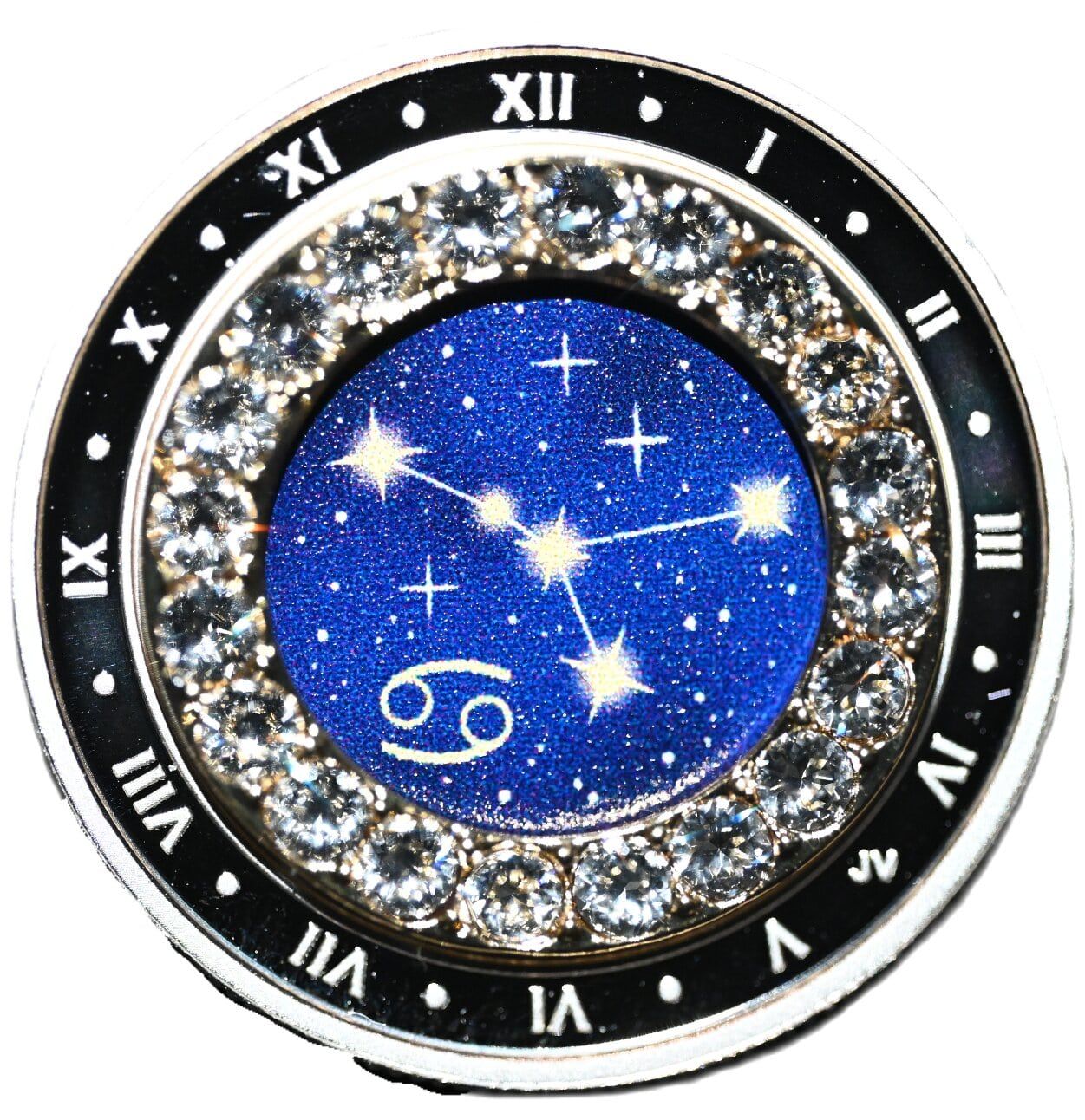 Описание: На зворотному боці монети, створеному художником Йорі ван дер Лінде, зображено гравіроване зовнішнє кільце з римськими цифрами, що нагадує класичний годинник. Внутрішнє кільце з кристалів Swarovski® оточує барвисте зображення на тему зодіаку, яке поєднує сузір'я та символ, пов'язані з Раком (21 червня – 22 липня).