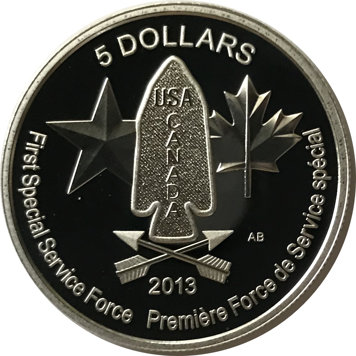 Описание: У центрі — нашивка Першої спеціальної служби (на прізвисько «Бригада диявола»), ліворуч від нашивки — зірка США, праворуч — канадський кленовий лист, під ними — схрещені стріли та рік. Номінал уздовж верхнього краю, назва підрозділу англійською та французькою мовами — внизу. Ініціали дизайнерів (AB) під кленовим листом праворуч від стрілки.